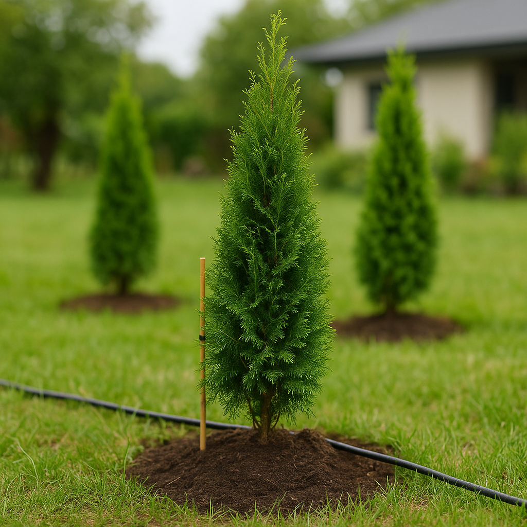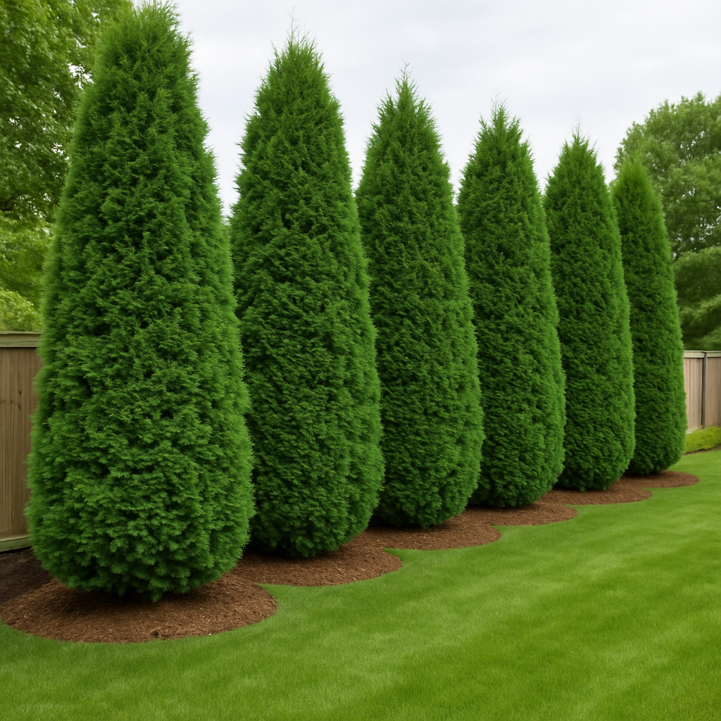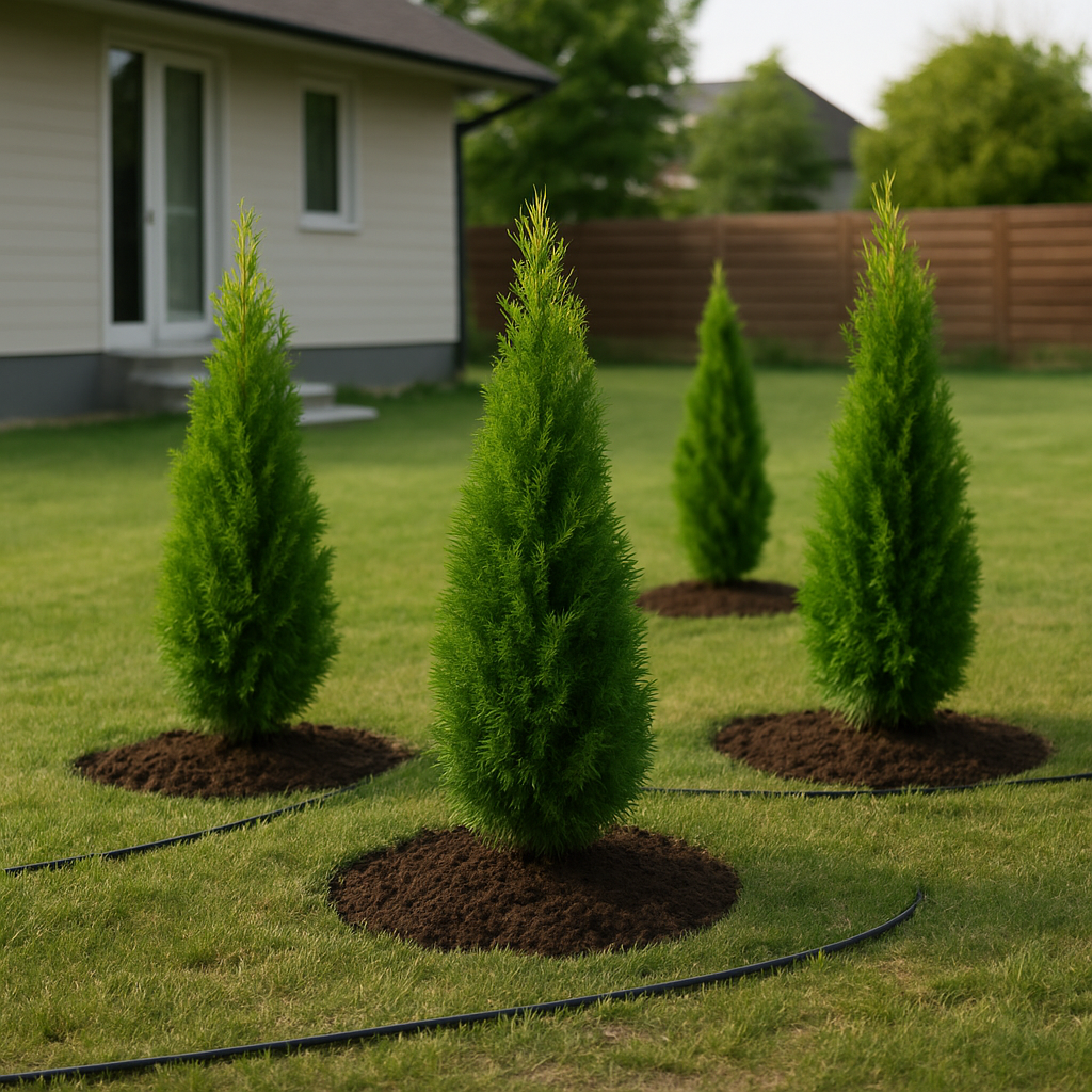 Живая, плотная зелёная линия, которая скрывает двор от дороги и соседей, делает въезд аккуратным и «собранным», а зону отдыха — уютной. Туи гармонично смотрятся у забора, вдоль дорожек и у дома, не ссорятся с остальными посадками и круглый год держат цвет.